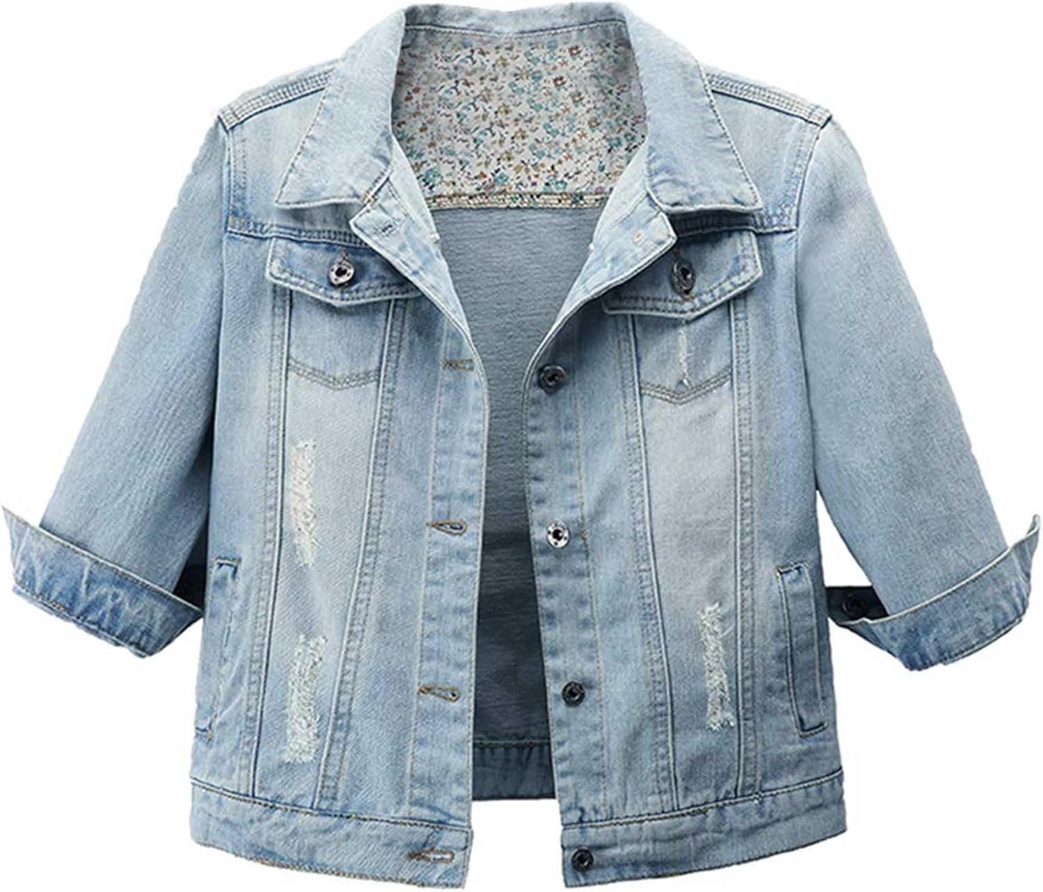 Women Autumn 3/4 Sleeve Retro Short Denim Jackets Light Blue Jean Coats