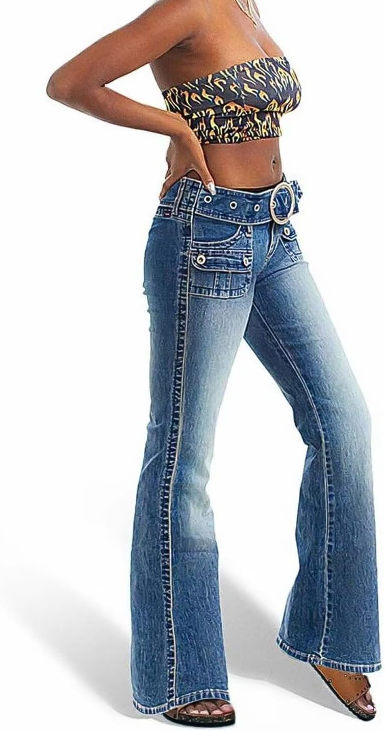 - Features:Low waist strechy flare leg jens with buckle belted. Buckle belted detail contribute to the overall design of garments; Flare leg provides a clean and delicate finish and adds a subtle and polished detail to the garment; Denim material makes it look vintage and easy on the eyes; These versatile capri jeans are perfect for casual wear, offering both style and comfort for casual days out