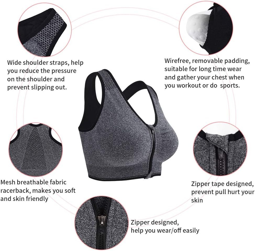 Women Zip Front Closure Sports Bra – Seamless Wirefree Post Surgery Zipper Padded Racerback Workout Gym Yoga Bras